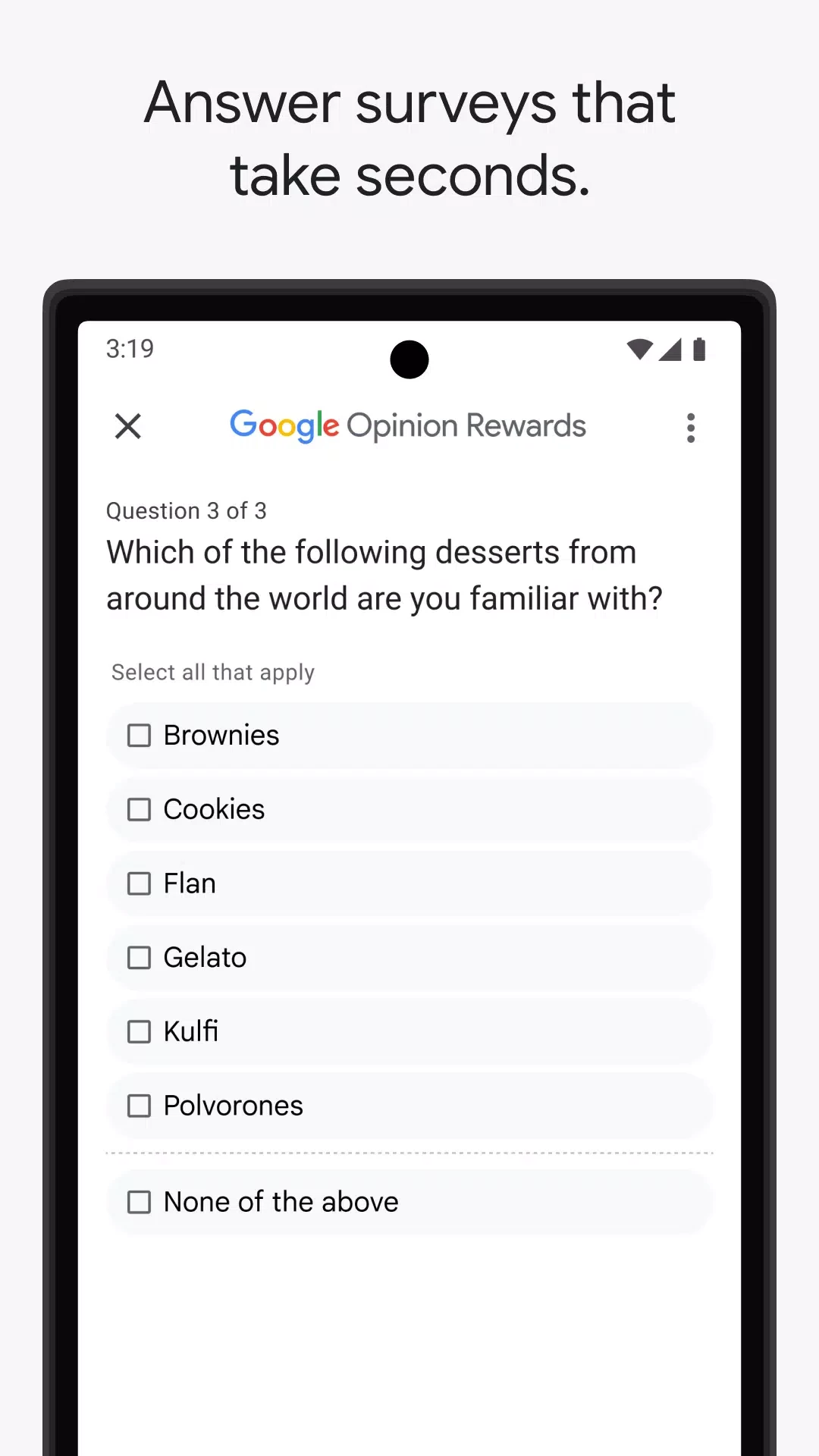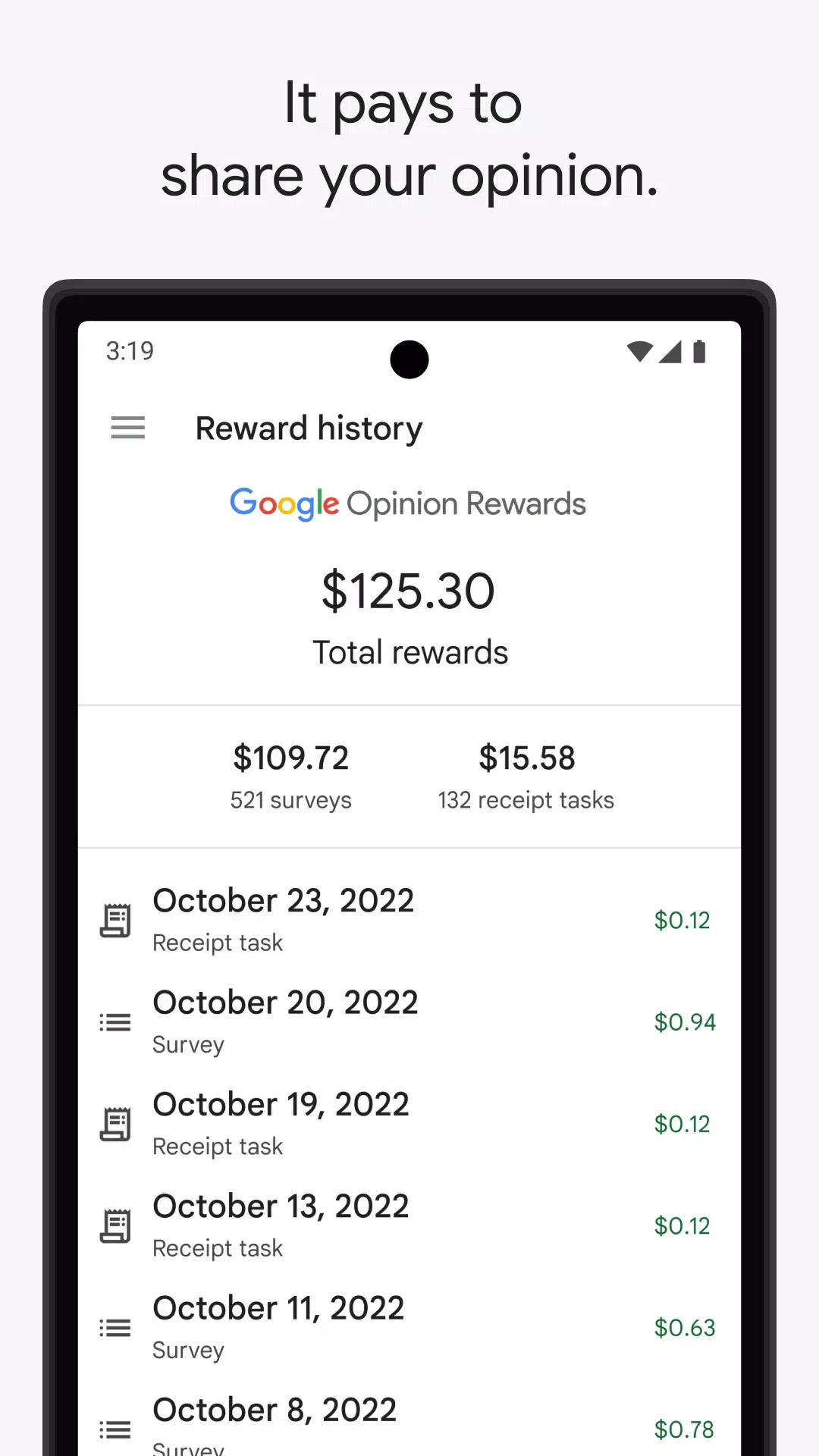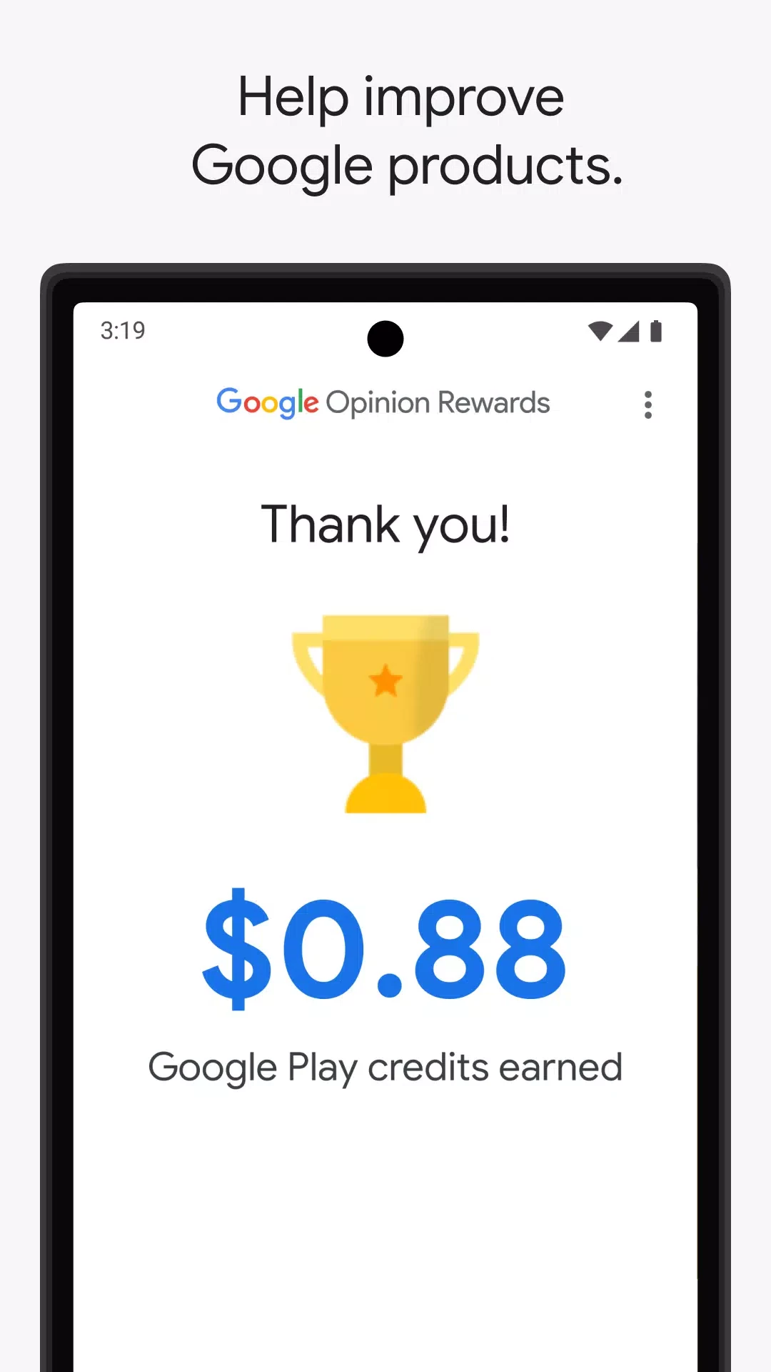 Google Opinion Rewards is an exciting lifestyle application that offers short surveys about different brands and services, and allows users to give their feedback and get Google Play Credits in return. It targets the primary everyday consumer, facilitating them to short questionnaires, which are created according to their shopping habits and other media preferences.