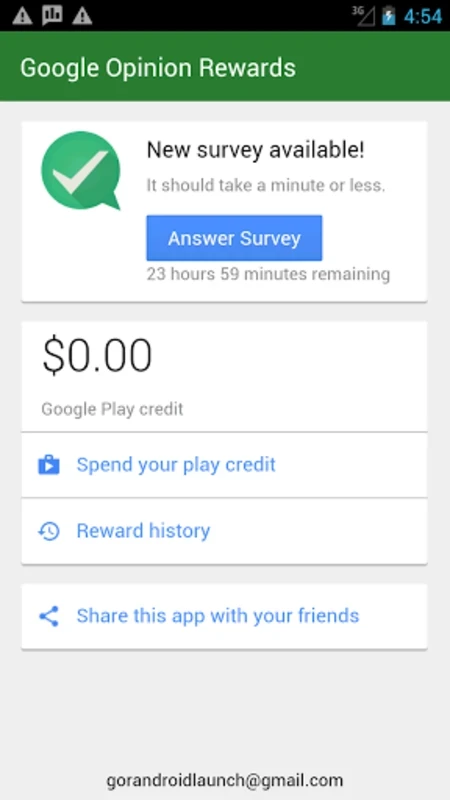 The earned credits, ranging from ten cents to one dollar per survey, are stored in the Google Play Store, and make your Google Play purchasing simple and easy with a few clicks. However, the app is limited to 39 countries, so it is not possible to manually request to participate in the app.